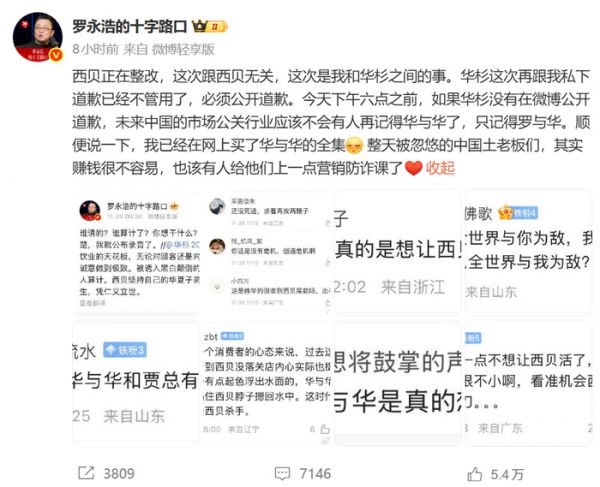 随后战火迅速升级, 当天中午,罗永浩发布置顶微博,明确要求华杉必须公开道歉,并称私下道歉已无效。