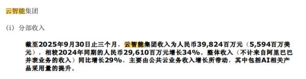 云智能集团本季度收入同比增长34%至398.24亿元,其中AI相关产品收入连续第九个季度实现三位数增长。