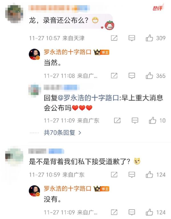 【#罗永浩否认私下接受华杉道歉#】#华与华创始人仍未回应# 11月26日,@罗永浩的十字路口 喊话华与华营销咨询有限公司创始人@华杉2009 公开道歉。不过,截止目前华杉仍未回应。27日,罗永浩回复网友称,并未私下接受道歉,当然会公布录音。