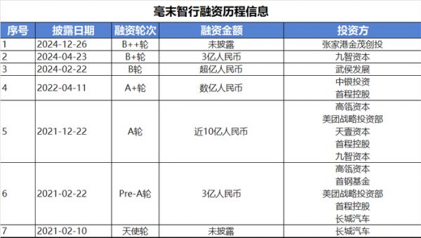 天眼查信息显示,毫末智行自创立至今已完成7轮融资,背后投资方聚集了美团、高瓴、高通、九智资本、首程控股等知名机构。在2021年12月,毫末智行完成近10亿元A轮融资,投后估值超10亿美元,跻身独角兽行列。