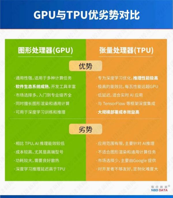 AI专用芯片(TPU,张量处理单元)与通用处理器(GPU,图形处理单元)的技术路线之间的差异,决定了各自的市场定位与竞争力。