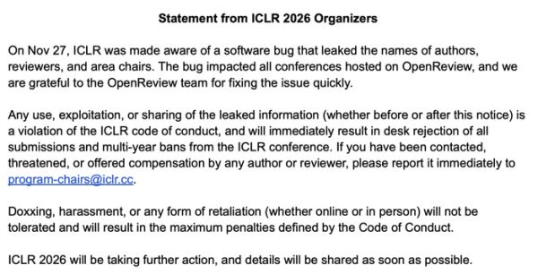 ICLR 表示任何使用、暴露或分享泄露信息的人都会被拒稿且常年被 ICLR 禁入,大会方未来还计划采取进一步的行动。