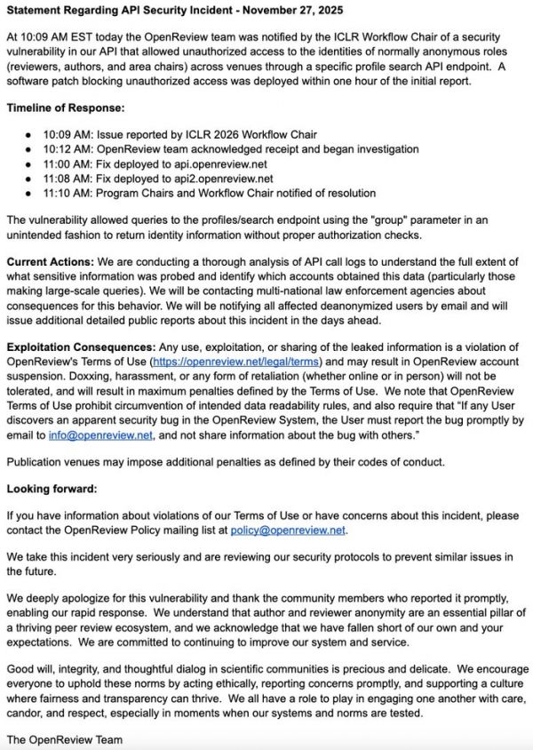 随后,OpenReview 也给出了官方公告。