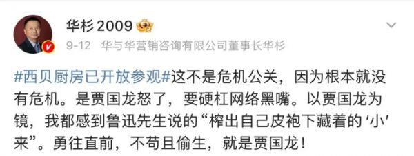11月25日,华杉在微博上再度为西贝发声,称西贝“被诱入黑白颠倒的网络罗刹国,被人算计”。