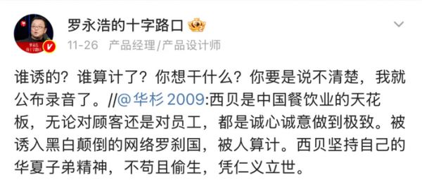 罗永浩在11月26日的微博中划清界限:“西贝正在整改,这次跟西贝无关,这次是我和华杉之间的事。”
