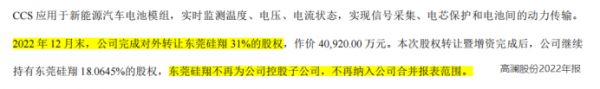 2022年公司转让了东莞硅翔31%股权,剥离了新能源汽车动力电池加热、隔热等业务。