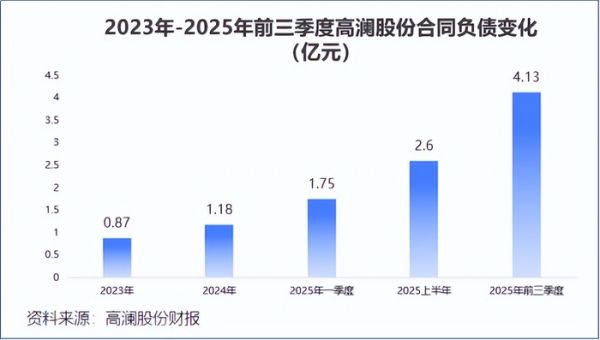 图中能直观看出来,2023-2024年底,高澜股份合同负债变化不算大。但在进入2025年后,便像开了挂般快速增长,从一季度末的1.75亿,直接飙升至三季度末的4.13亿,与2024年末相比大增250%。