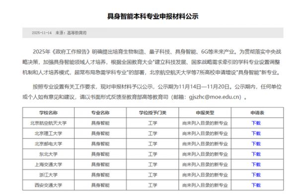 根据教育部公示,今年以来,北京航空航天大学、北京理工大学、北京邮电大学、东北大学、上海交通大学、浙江大学、西安交通大学、哈尔滨工业大学、南京航空航天大学等高校,陆续申报增设“具身智能”或“具身智能工程”本科专业。有的学校还同时布局“未来机器人”等相关新专业。