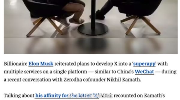 12月2日消息,据Economic Times报道,在和Zerodha联合创始人尼基尔·卡马斯(Nikhil Kamath)的对话中,特斯拉首席执行官埃隆·马斯克(Elon Musk)再次明确表示,想要把社交平台X打造成中国以外的“微信升级版(WeChat++)”,使其兼具信息发布与金融支付等多种功能。