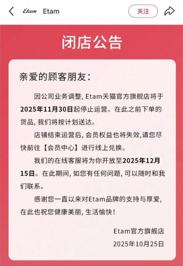 据21世纪经济报道消息,日前,法国服饰品牌Etam艾格发布消息,宣布Etam天猫官方旗舰店于11月30日停止运营。12月2日,记者已在天猫平台查无此店。据其工作人员透露,小红书、抖音店铺也同步关闭。