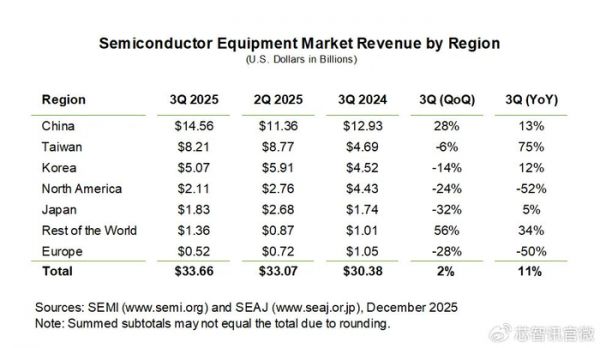 2025Q3全球半导体设备市场:中国大陆位居第一,占比高达43%!