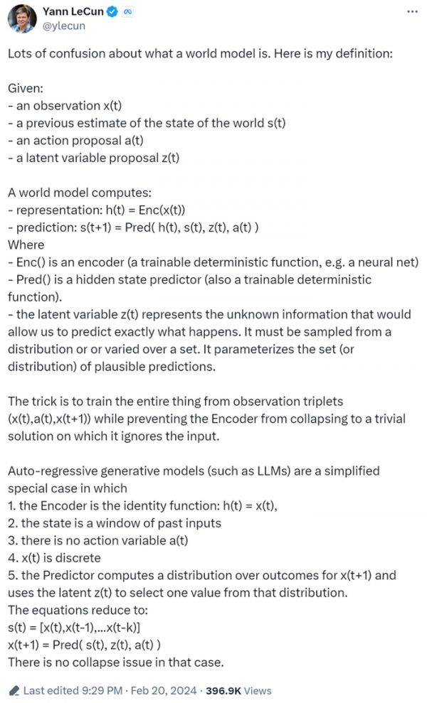 在这篇推文中,LeCun明确定义了一个世界模型需要同时输入四个变量,对先前世界状态的预估s(t),对当前的观察x(t),当前的动作a(t),一个潜在变量z(t),结合四个变量来预测下一时刻的世界状态s(t+1)。
