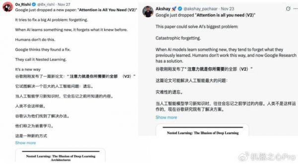 近期,Google Research 的一篇名为《Nested Learning: The Illusion of Deep Learning Architectures》的论文大范围「出圈」,被业界看作是论文《Attention is All You Need》的 V2 版。
