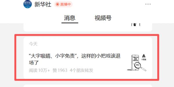 12月5日新华社发文谈论小字宣传方案,文章标题为《“大字吸睛、小字免责”,这样的小把戏该退场了》,引起了较多网友的关注。
