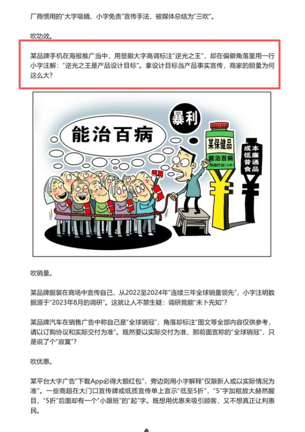 新华社在文章中指出,某品牌手机在海报推广当中,用显眼大字高调标注“逆光之王”,却在偏僻角落里用一行小字注解:“逆光之王是产品设计目标”。拿设计目标当产品事实宣传,商家的胆量为何这么大?