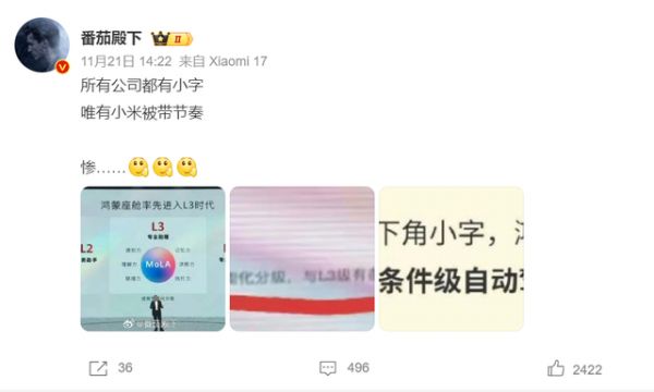 譬如博主番茄殿下表示,所有公司都有小字,唯有小米被带节奏。