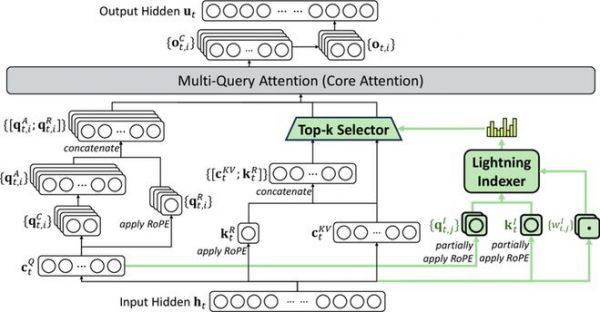 传统注意力机制的计算复杂度是 O(L²),序列长度翻倍,计算量就要翻四倍。DSA 通过"闪电索引器"(Lightning Indexer)快速计算每个 token 的重要性评分,然后只选择 top-k 个最重要的 token 参与注意力计算(论文中 k=2048),将复杂度从 O(L²) 降至 O(L×k)。