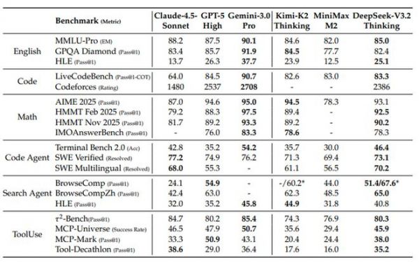 这个观察有数据支撑。论文对比了 DeepSeek V3.2 与 GPT-5、Gemini 3.0 Pro 在多个基准测试上的表现。在 MMLU-Pro(多学科知识测试)中,DeepSeek V3.2 得分 85.0,GPT-5 是 87.5,而 Gemini 3.0 Pro 达到了 90.1。在 GPQA Diamond(研究生级别科学问题)测试中,三者的得分分别是 82.4、85.7 和 91.9。