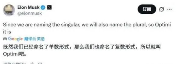 他在社交平台 X 上发文,澄清既然特斯拉公司为该机器人确定了单数名称“Optimus”,那么其复数形式也应由公司来定义。因此对于媒体而言,如今多个 Optimus 机器人应被称为“Optimi”。