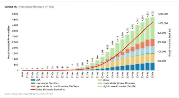 如今,随着人形机器人逐步走出实验室,进入多样化的应用场景,对其需求也日益凸显。前不久,摩根士丹利的全球可寻址市场(TAM)模型给出了一个震撼的预测:到2050年,全球人形机器人保有量将达到10亿台,年收入市场规模可达近5万亿美元。
