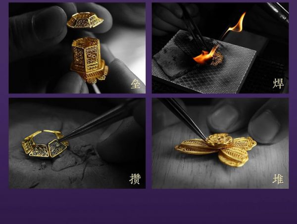 该技艺要求匠人将黄金千锤百炼、抽拔成丝,再以指尖演绎掐、填、攒、焊等数十道细腻工序,使细过毫发的金丝在时光中交织、堆垒、编织成灵动繁复的立体纹样。