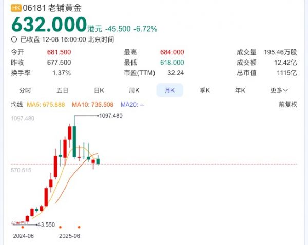 这期间,老铺黄金还曾于今年9月30日触顶过1097.48港元/股,市值一度飙升至1937亿港元。