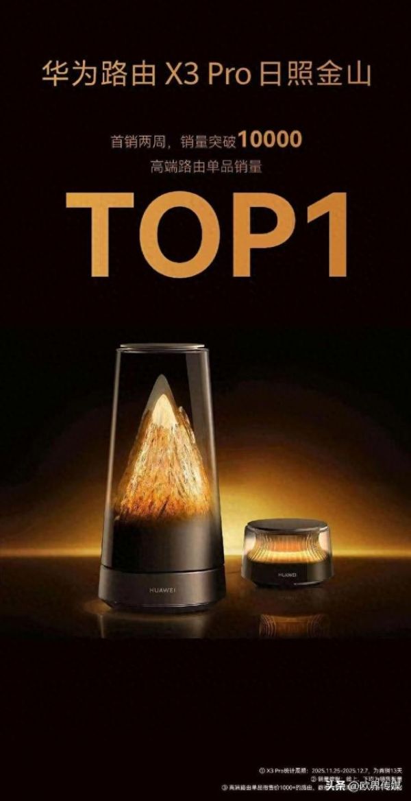高端路由器市场,一个长期被性能参数和同质化竞争主导的领域,被一款命名为“日照金山”的华为路由X3 Pro打破了沉寂。2025年11月底上市后,它在两周内销量突破10000台,拿下了中国高端路由器单品销量第一。