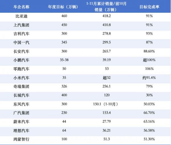 比亚迪与上汽集团1-11 月累计销量均突破400万辆,分别达418.2万辆和 410.8万辆,同比增幅均超10%,对应460万辆、450万辆的年度目标,完成率均达91%,大概率能如期达标。