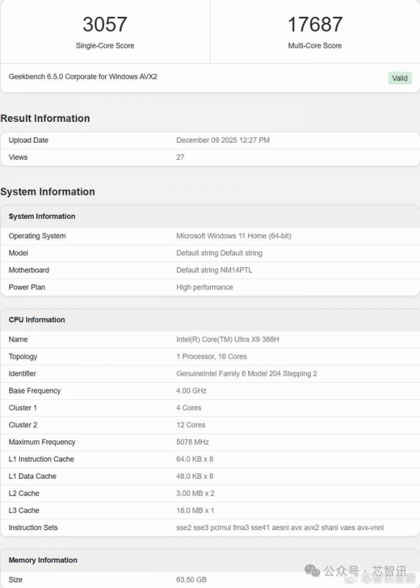 12月9日消息,据外媒wccftech报道,基于Intel 18A制程的旗舰版英特尔Panther Lake芯片——Core Ultra X9 388H的Geekbench测试成绩曝光。