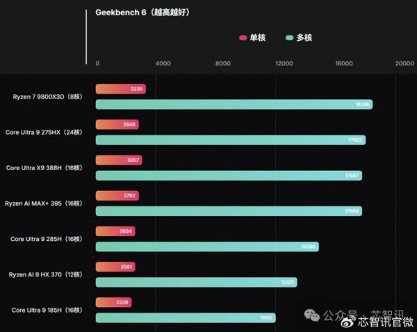 根据Geekbench测试结果显示,英特尔Core Ultra X9 388H单核测试得分高达3057分,多核测试得分17687分。作为对比,其单核性能比前代Core Ultra 9 285H提升近15%,且与旗舰机型、主流最快移动芯片AMD Ryzen AI Max+ 395相当。