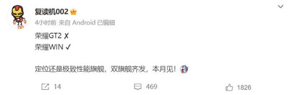 12月11日消息,据博主数码闲聊站(小号)消息,荣耀GT2将会改名为荣耀WIN系列,并有望于本月发布。