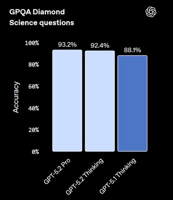 在科学问题方面,GPT-5.2 Pro 在 GPQA Diamond 测试中取得了 93.2% 成绩。GPT-5.2 Thinking 也有 92.4% 的高分。双双打破了 Gemini 3 Pro 保持的纪录。