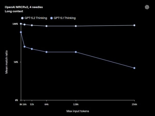 处理需要跨越数十万 token 相关信息的真实任务时,GPT-5.2 Thinking 的准确性远超 GPT-5.1 Thinking。它是第一个在四针 MRCRv2 测试中(最多 256k token)实现接近 100% 准确率的模型。