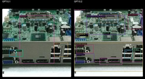 相比之前的模型,GPT-5.2 Thinking 对图像中元素位置的把握更强。例如,在识别主板图像中的组件并返回大致边界框的任务中,即使在低质量图像上,GPT-5.2 也能识别主要区域并放置与每个组件真实位置有时匹配的框,而 GPT-5.1 只能标记少数部分,对空间排列的理解要弱得多。