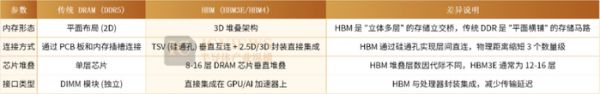 HBM 的技术优势源于其独特的结构设计与制造工艺。它通过将多片 DRAM Die 与 Logic Die 借助 TSV(硅通孔)和 Bump(凸点)实现垂直互连,再经中介层与 GPU 集成于 ABF 载板,最终通过系统级封装(SiP)形成一体化产品。这种设计不仅缩短了信号传输路径、降低了功耗,更实现了 1024bit 的超高总线位宽(HBM1 到 HBM3E 均保持在 1024bit),完美匹配 AI 芯片的高带宽需求。