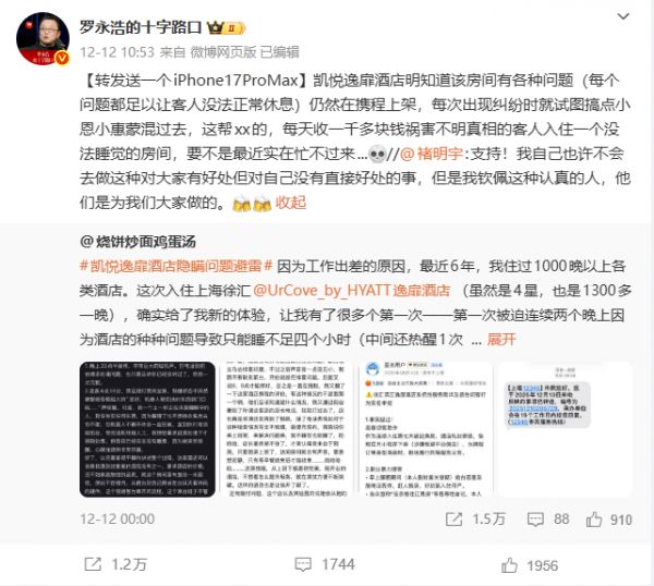 图源:微博这事儿被罗永浩看到后,直接转发开怼:“凯悦逸扉酒店明知道房间有各种问题,每个问题都足以让客人没法正常休息,却仍然在携程上架,每次出现纠纷时就试图搞点小恩小惠蒙混过去。每天收一千多块钱祸害不明真相的客人,要不是最近实在忙不过来……”
