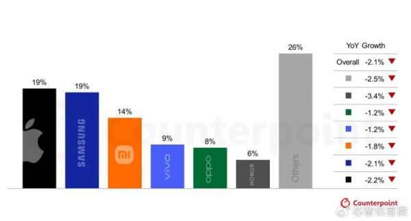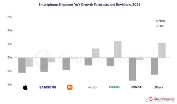 从具体的品牌厂商表现来看,在2026年的智能手机市场,前六大智能手机厂商分别为苹果(份额为19%)、三星(19%)、小米(14%)、vivo(9%)、OPPO(8%)、HONOR(6%),但是他们的出货量均出现了同比下滑,下滑幅度分别为2.2%、2.1%、1.8%、1.2%、1.2%、3.4%。