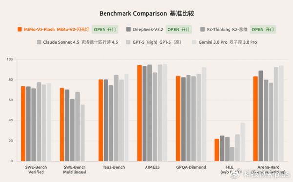 当然,这些参数什么的,一般人也看不懂,那我就说一个大家看的懂的,那就是经过测试,在多个Agent测评基准上,MiMo-V2-Flash位列全球开源模型Top 2。它的综合性能,达到了DeepSeek-V3.2的水平,甚至有些项目,还要更强一点。