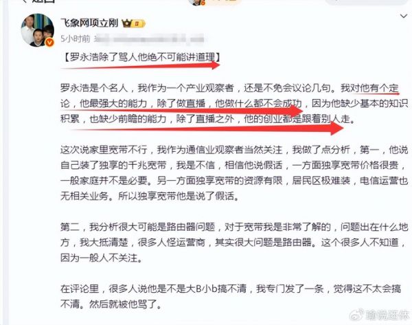 一向自谓是“通讯观察专家”的那位“著名中专生”——“项中专”,此人可是有热度必蹭的主儿,他很快就以《罗永浩除了骂人,他绝不可能讲道理》为题如此评价罗永浩道: