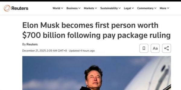 【环球网科技综合报道】11月21日消息,路透社报道,特斯拉公司首席执行官埃隆·马斯克净资产突破7000亿美元,创下个人财富纪录。此前,美国特拉华州最高法院刚刚作出裁决,恢复其在2018年获得的价值约560亿美元的特斯拉股票期权方案。该方案曾于2022年被下级法院以“令人难以置信”为由驳回,并于2024年初被撤销。
