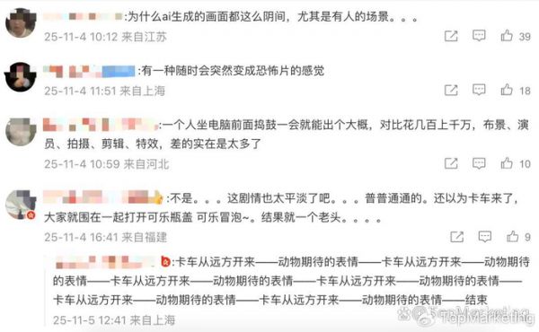 “为什么ai生成的画面都这么阴暗,尤其是有人的场景”、“不是。。。这剧情也太平淡了吧”、“每个动物露张脸好无聊”……在可口可乐2025年圣诞短片上线后,失望和差评如潮水般涌来。