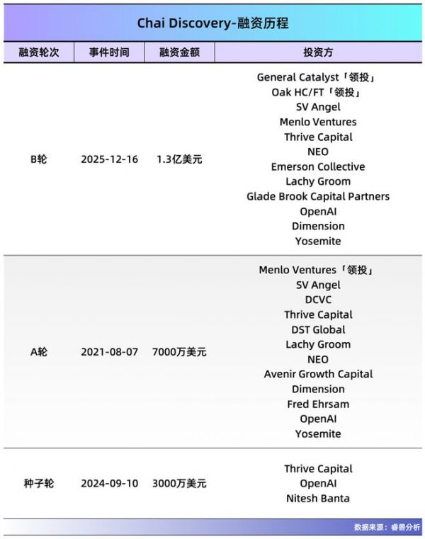 自2024年成立以来,Chai Discovery完成了3轮融资,总融资额达2.3亿美元,获得了OpenAI、Thrive Capital、Menlo Ventures、General Catalyst、Oak HC/FT等机构的连续押注。