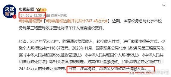 12月5日,国家税务总局北京市税务局的通报给出了明确答案:2021至2023年期间,陈震通过少报收入、转换收入性质等方式,少缴个人所得税118.67万元,最终被追缴税款、加收滞纳金并处罚款共计247.48万元。