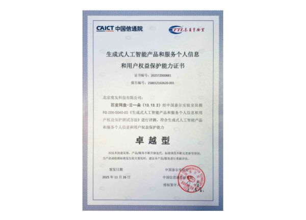 近日,百度网盘通过中国信息通信研究院(下称“中国信通院”)组织的生成式人工智能产品和服务个人信息和用户权益保护能力评估,获得"卓越型"认证。“卓越型”是该评估体系的最高级别,标志着百度网盘在生成式AI个人信息保护领域达到行业领先水平。