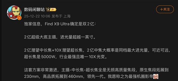 OPPO Find X9系列出了标准版、Pro,上周冷不丁地又冒出个X9s的爆料,不过目前该机型还未发布。现在,超大杯OPPO Find X9 Ultra的消息终于也有了。今天,博主@数码闲聊站 的独家信息曝光了其影像配置,此前爆料的双2亿方案终于得到确定,手机影像的表现让人非常期待。