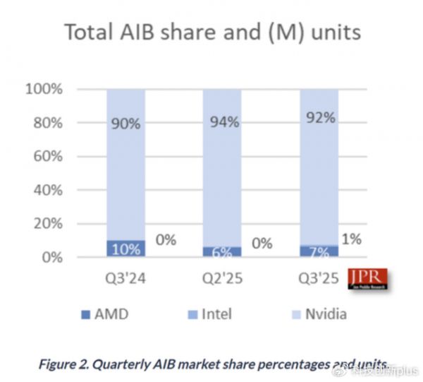 数据显示,从目前全球独立显卡GPU市场来看,英伟达的份额高达92%,AMD为7%,而英特尔为1%。