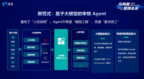 面对 AI 的错误、AI 的侵权及对 AI 的“攻击”等新型挑战,数美重构了“人机协同”模式——引入基于大模型的审核 Agent。