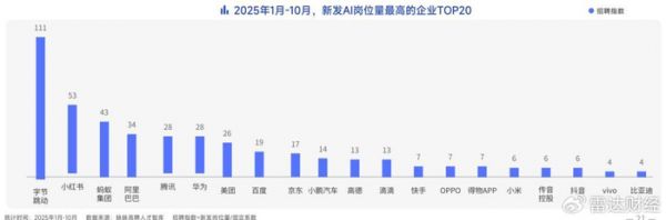 雷达财经从《2025年度人才迁徙报告》中了解到,在今年的新发AI岗位竞争中,字节跳动呈现出断崖式领先的优势:其招聘指数高达111,将竞争对手阿里巴巴(34)和腾讯(28)远远甩在身后。