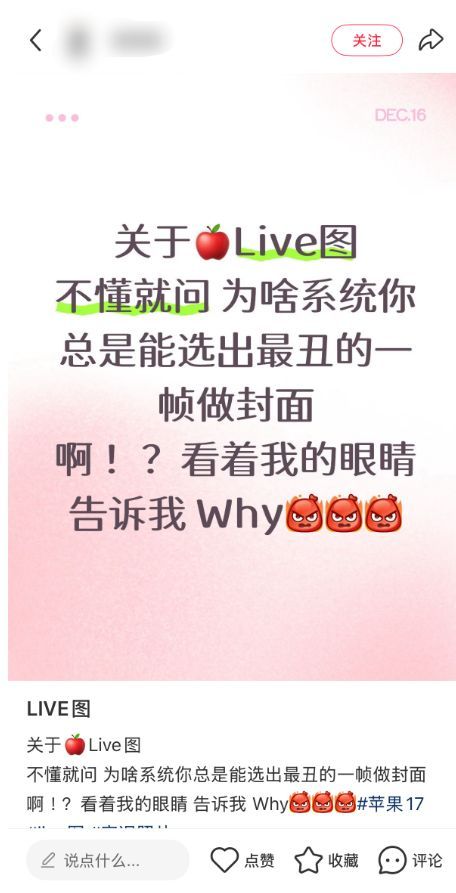 图源:小红书网友称苹果的实况选封面的机制简直就像开盲盒,总能精准定格到最尴尬的瞬间。纷纷吐槽拍合照的时候别人都是睁眼,就自己闭眼了,结果实况图偏偏选这一帧当封面。