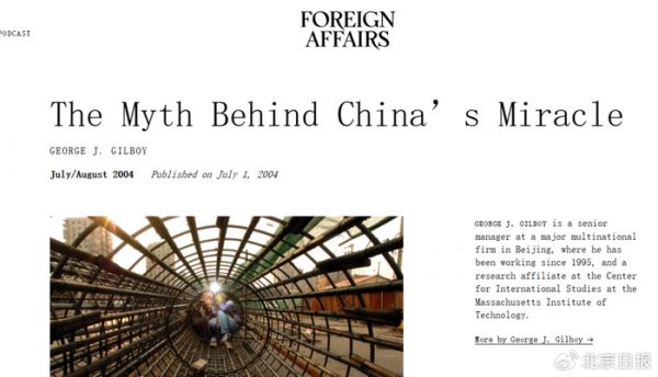 2004年,美国权威媒体《外交事务》杂志刊登了一篇题为《中国奇迹背后的神话》(The Myth Behind China’s Miracle)的文章。作者乔治.吉尔坡(George J. Gilboy)在文中试图为当时甚嚣尘上的“中国威胁论”降温,结论却并非善意的“理性纠偏”,而是一种带着傲慢的否定:中国不值得担心。